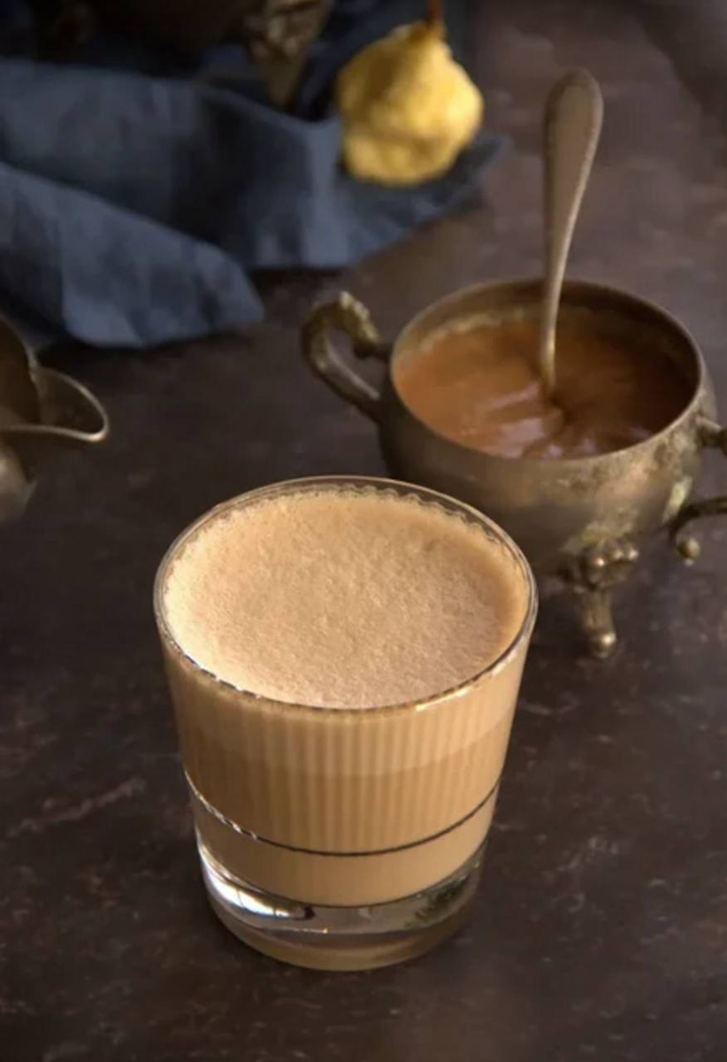 4. Отдельно слегка взбейте в блендере 100–150 мл тёплых сливок или молока, затем вылейте в чашку с кофе и урбечом, получив нежный раф .