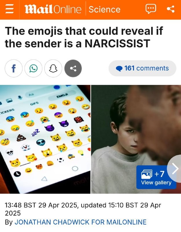 Если ты закидываешь эмодзи направо и налево — у психологов для тебя плохие новости. 😬 Учёные из Оклахомы провели исследование на 285 людях и выяснили: активное юзание смайликов может говорить о тёмных чертах — нарциссизме, психопатии и даже склонности к манипуляциям. Особенно у мужчин. У женщин — нарциссизм рулит. Смайлики — не такие уж и безобидные. 🫠 Вторая картинка — список «подозрительных» эмодзи. Подробнее: https://hard-tm.su/threads/88348/ 🕹HARD-TM — Подписаться