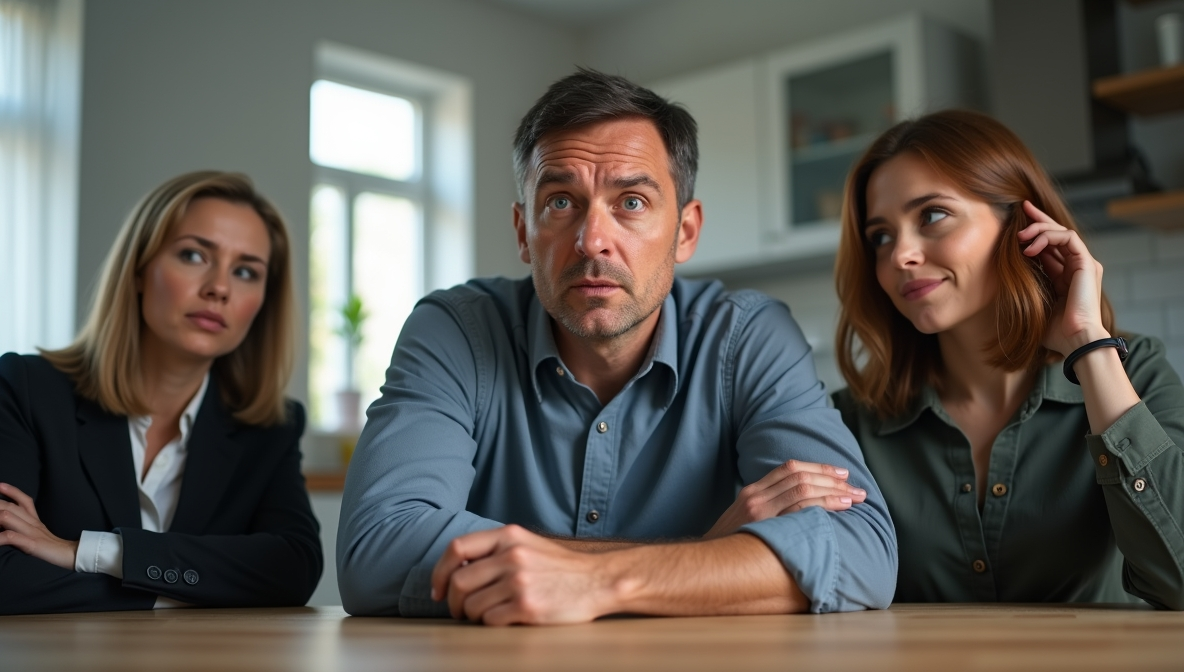 Сергей прошёл в гостиную и замер на пороге. За столом сидели две женщины. Его жена Ольга — с непривычно прямой спиной и чуть приподнятым подбородком. И рядом с ней — Марина, его... Сергей сглотнул. Его любовница.