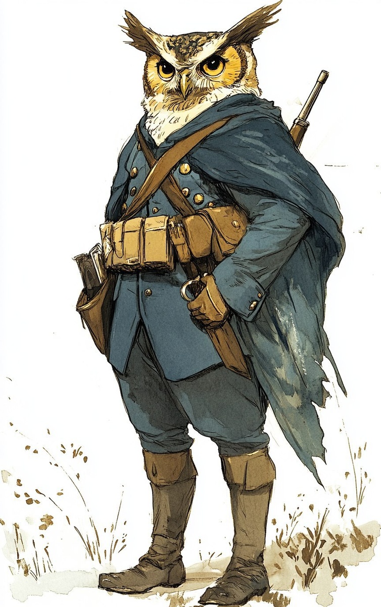 Создано на основе запроса: graphic novel illustration of an owl outfitted like a soldier from 1865