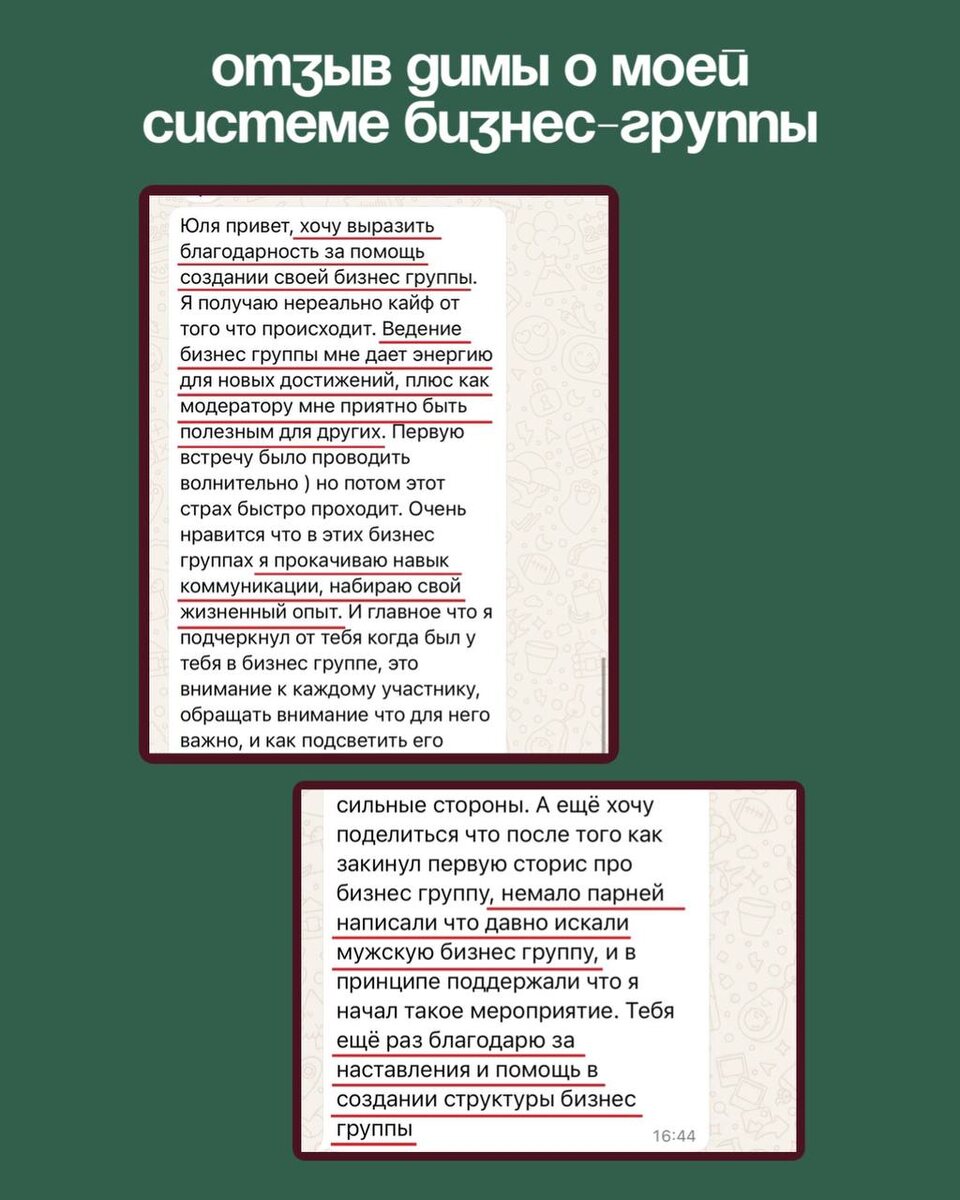 Я поделилась всем: рабочими приёмами, подходом, стратегией, ключевыми моментами, которые дают быстрые и ощутимые результаты. Дима запустил свою группу, и ей уже три недели.