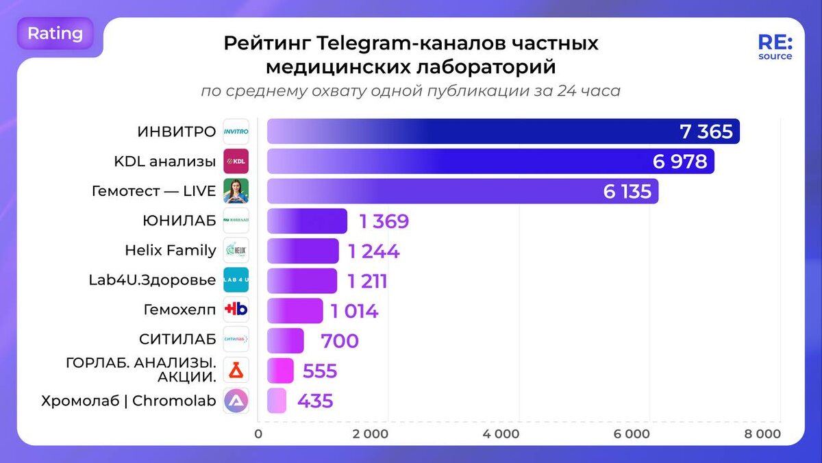 🔹🔹🔹 Канал ИНВИТРО самый охватный среди медицинских лабораторий в Telegram При этом на первом месте по виральности другой канал — Гемотест, у которого репостов в 4,5 раза больше. Рейтинги Telegram-каналов из других сфер: 🏋🏻Онлайн-фитнес 🛍️Маркетплейсы 🎓Университеты Источник: TGStat #TGrating Подписаться на RE:source