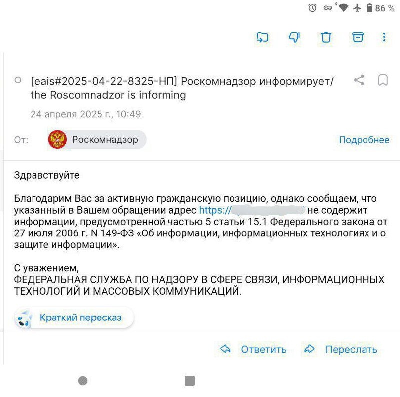 Пришёл ответ от РКН (Роскомнадзор). Я отправлял там сайт на проверку. Очень он похож был на наркоманский. Но, им виднее. Закон есть закон. Согласен с ними.