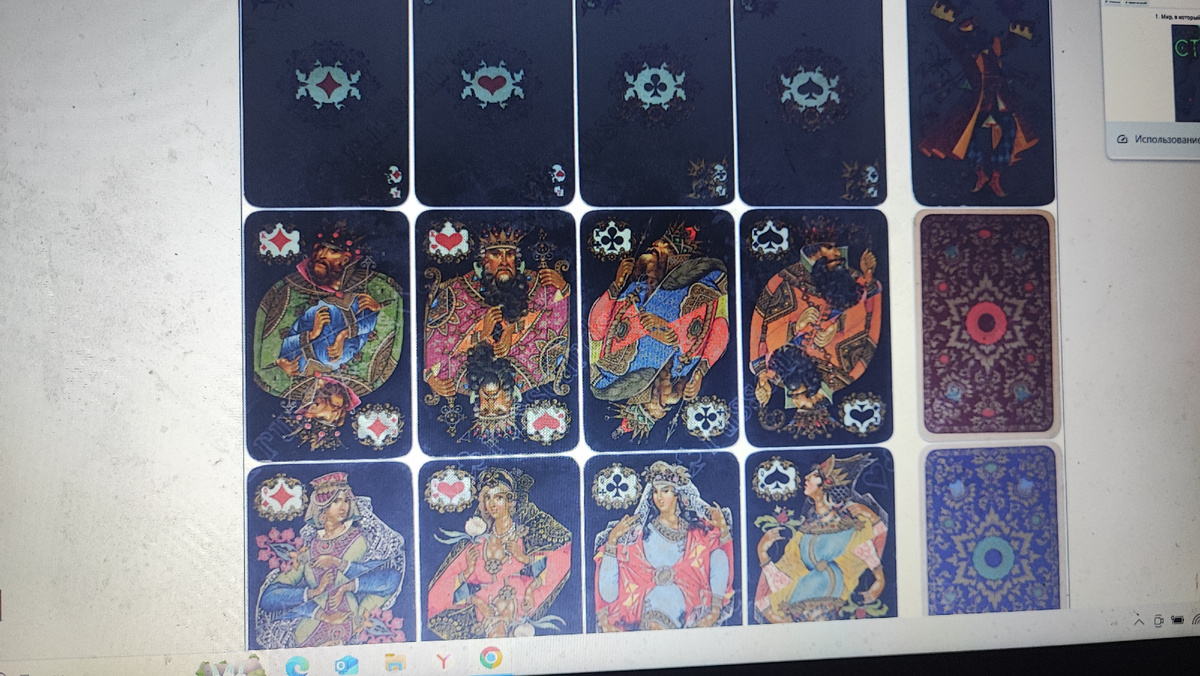 В 1937 году на выставку в Париже послали игральные карты. Как достижение советской полиграфии... У меня той колоды нет - фото из интернета... А вот те, что выпущены к 150-летию, у меня есть. Заметьте: там ОСТ, тут - ТУ еще Обратите внимание: золотой краской шрифт, а не черной... У меня есть карты 1967 года. Но не "Юбилейные" :0))) А жаль. Вот "Палех", 1992 г. А вот "Белый Палех" Ужас и халтура, как по мне... :0(( Но.... Но! Это это реально - наша русская культура. НЕ МЫ ТАКИЕ, СТРАНА ТАКАЯ (я) ПС Забыл добавить: за Юбилейные в и-то просят от 1000 до 5000 р. А ведь какие мы, такая и страна.... :0) ППС Нашел у себя еще две колоды "Белого Палеха". 1986 и 1990 года. На рубашке - Георгий Победоносец.