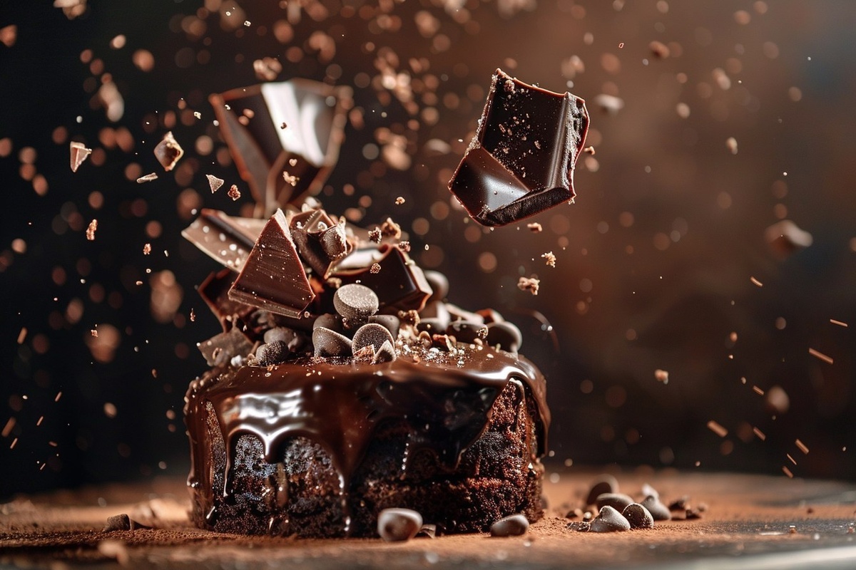 Создано на основе запроса: a delicious chocolate cake jumping happily in mid-air, rich glossy chocolate glaze, splashes of chocolate and