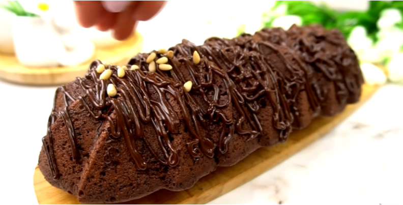 Достаем готовый кекс, вынимаем из формы. Поливаем глазурью, я сегодня решила посыпать кедровыми орешками.