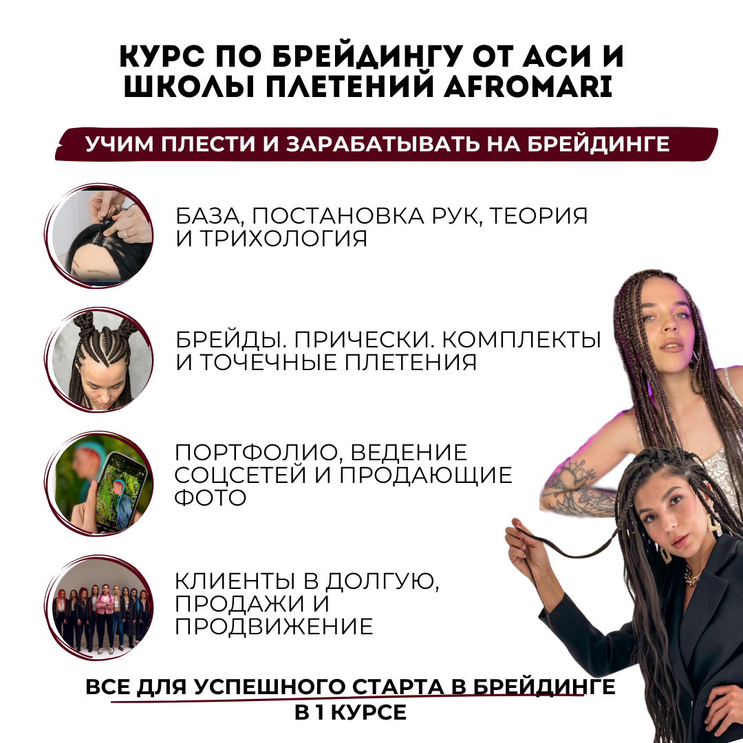 Мечтаешь плести крутые косы и зарабатывать на этом? Тогда тебе к нам! Мы открываем набор во вторую тестовую группу. 🔥 Что тебя ждет? — Ася, гуру узоров и техник плетения, поставит руку, научит всем тонкостям работы с канекалоном и создания сложных брейдов. — Мария, владелица бренда косметики и материалов для плетения AFROMARI, онлайн-школы с крупным YouTube-каналом и двух студий, отдаст все свои наработки за 7 лет владения студий, поделится хитростями, которые помогут работать с моделями не за материал, а за реальные деньги и фишками оформления соцсетей и аккаунтов, которые поднимают вас в поиске и гарантированно привлекут клиентов. 🔥 Полная база знаний для брейдера: — База, трихология, ссылки на проверенные материалы