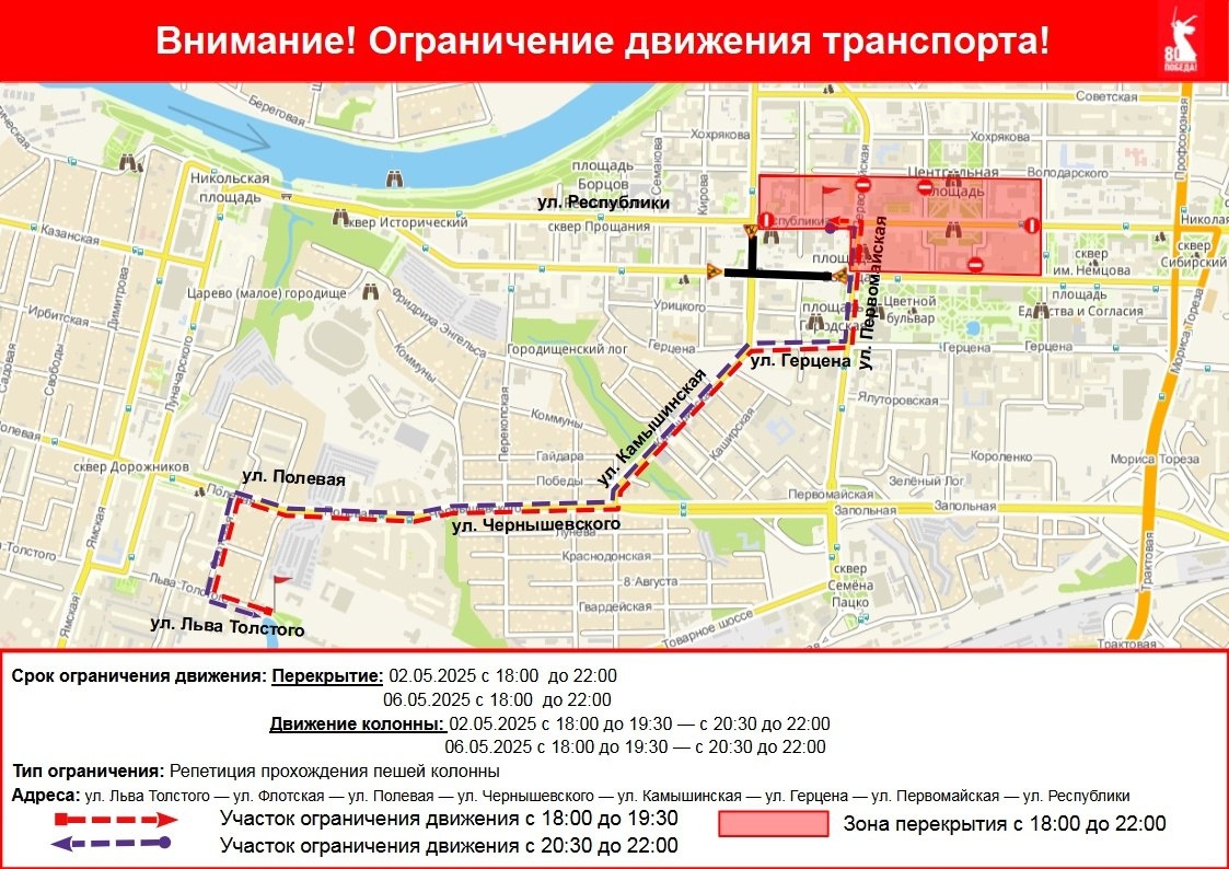 Внимание! Ограничение движения транспорта! Информируем о прекращении движения транспорта на время проведения репетиции парада, посвященного Дню Победы в Великой Отечественной войне 1941-1945 годов, в периоды с 18 до 22 часов 02.05.2025 и с 18 до 22 часов 06.05.2025 на следующих участках автомобильных дорог: - ул. Республики – от ул. Орджоникидзе до ул. Челюскинцев; - ул. Первомайская – от ул. Хохрякова до ул. Ленина. Всем участникам дорожного движения рекомендуем обращать внимание на знаки, соблюдать Правила дорожного движения РФ. Схемы объезда: ул. Герцена, ул. Советская, ул. Орджоникидзе, ул. Володарского. Также будет ограничено движение всех видов транспортных средств в связи с прохождением пешей колонны участников по случаю репетиции торжественного прохождения войск парадных расчетов Тюменского гарнизона и духового оркестра, посредством распорядительно-регулировочных действий по ходу движения пешей колонны по автомобильным дорогам. Каким?
