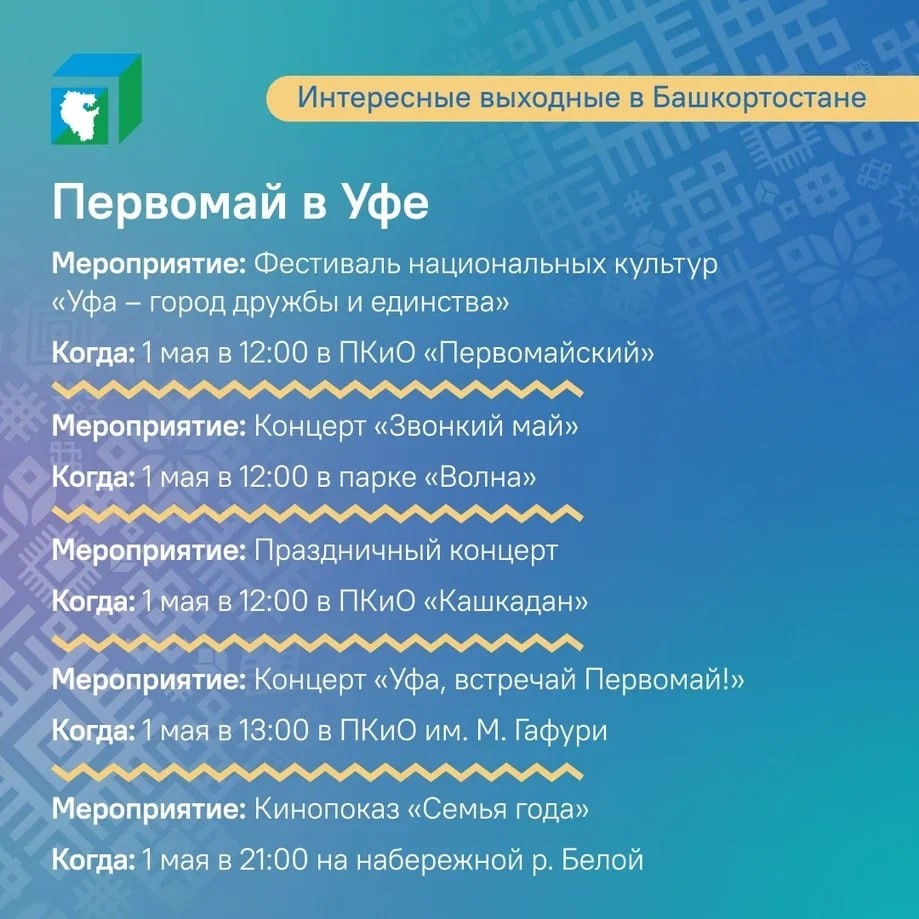 👋👋👋👋👋👋 Первомай в Башкортостане обещает много музыки, спорта, интересных встреч и ярких впечатлений. В Уфе 1 мая в парках культуры и отдыха – концерты, выставки, мастер-классы и игровые программы, а на набережной реки Белой – кинопоказ. Подробнее – на официальном сайте gorodufa.ru В Баймакском районе 1 мая – праздник весны и труда «Звени, играй, наш Первомай!». На Центральной площади Баймака – старт велопробега Баймак – Уфа, праздничная торговля и концерт городских детских творческих коллективов. Начало в 10:00. День весны и труда отметят 1 мая в Сибае – праздничная программа пройдет в экопарке «Терра Зауралье». Большой концерт, веселые конкурсы и игры для детей – программа начнется в 10:00. Районный праздник гармони им. Фадиса Нуриуллина – 1 мая в Кушнаренковском районе. На Центральной площади с. Кушнаренково соберутся талантливые гармонисты и музыканты со всего района. Начало в 11:00. В с. Старосубхангулово Бурзянского района 1 мая – ежегодная легкоатлетическая эстафета н