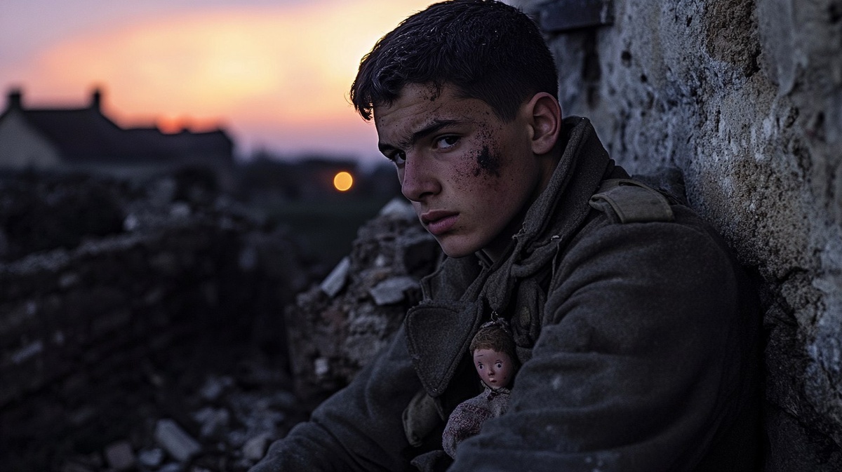 Создано на основе запроса: During a quiet but tense nighttime air raid, young soldier Nicolás Ortega, age 19, takes cover behind a crumbling stone wall in a partially destroyed village in Normandy. He wears a slightly damaged World War II uniform, without a helmet, his short dark hair damp from sweat and mist. His face is softly illuminated by the distant orange glow of flares and scattered fires. Around him, old bricks, abandoned belongings, and shadows tell the story of recent conflict. In the sky, planes pass overhead, casting brief moving lights. Despite the uncertainty, Nicolás remains alert, holding a small stitched doll partly hidden in his coat a symbol of calm in the middle of unrest. --- Автоперевод: Во время тихого, но напряженного ночного воздушного налета молодой солдат Николас Ортега, 19 лет, укрывается за разрушающейся каменной стеной в частично разрушенной деревне в Нормандии. Отлично вышло? 🤔 https://dzen.ru/id/65c0c65c86e4f837c27b24d7 #ИИ #AI #нейросеть #midjourne