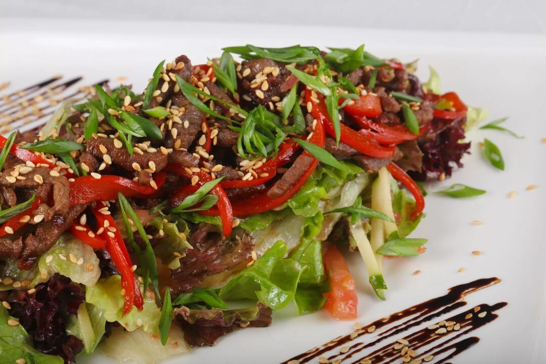 Тайский жареный салат с говядиной и овощами получается, конечно, довольно ярким как по вкусу, так и по внешнему виду. Игра вкусов просто изумительная, богатая, насыщенная. Такую кухню обязательно нужно любить, ты ее либо понимаешь, либо нет. Но то, что такой салат однозначно стоит попробовать, это факт! Обязательно обратите внимание на этот рецепт, возможно, вы откроете для себя что-то новое. Ингредиенты: Говядина - 150 г Помидоры мелкие - 3 шт. Огурцы свежие - 1 шт. Лук репчатый - 1 шт. Сладкий красный перец - 1 шт. Чеснок - 2 зубчика Соевый соус - 4 ст.л. Сахар - 1 щепотка Соль, перец - по вкусу Масло растительное - 2 ст.л. Петрушка - 2 веточки Сок лимона - 1 ст.л. Процесс приготовления Подготовить все продукты по списку. Ингредиенты указаны на одну большую порцию салата. Говядину ополоснуть и просушить, удалить обязательно все прожилки и пленку. Нарезать мясо тонкими длинными полосками.Очистить репчатый лук, сполоснуть и просушить. Луковицу нарезать полукольцами. Сладкий красный пе