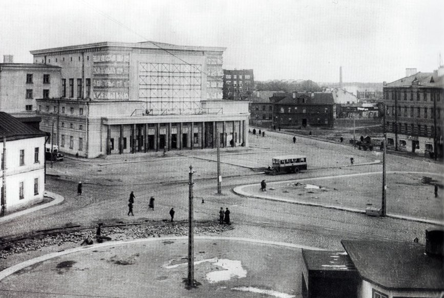 "На Выборгской стороне, там, где на краю поля до революции ютилась убогие лачужки, сейчас высится нарядный пятиэтажный корпус Дворца кино. 15 гранитных колонн открывают вход во дворец. Над ними поднимается стеклянная стена, за которой на шести экранах вскоре загорится гигантская кинореклама. По бокам лицевого фасада высечено 56 барельефов. Они изображают знакомые сцены из лучших произведений советской кинематографий. Вот Чапаев у пулемета. Николай Миронович – начальник политотдела из «Крестьян», улыбающийся Максим, Петя-Гулливер среди лилипутов…