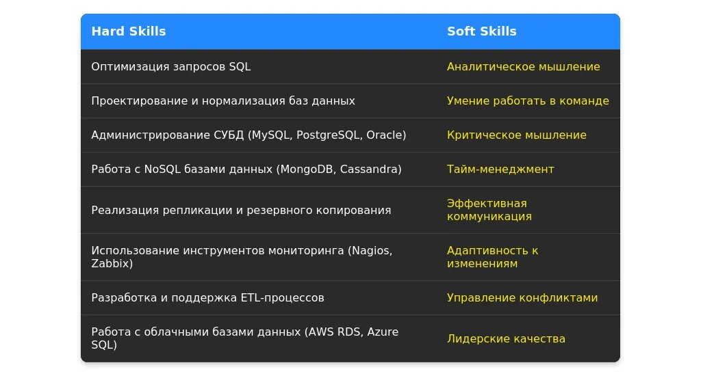 Навыки следует перегруппировать, выделяя ключевые компетенции, указанные в вакансии. Используйте ключевые слова, такие как "PostgreSQL", "оптимизация запросов", "резервное копирование".