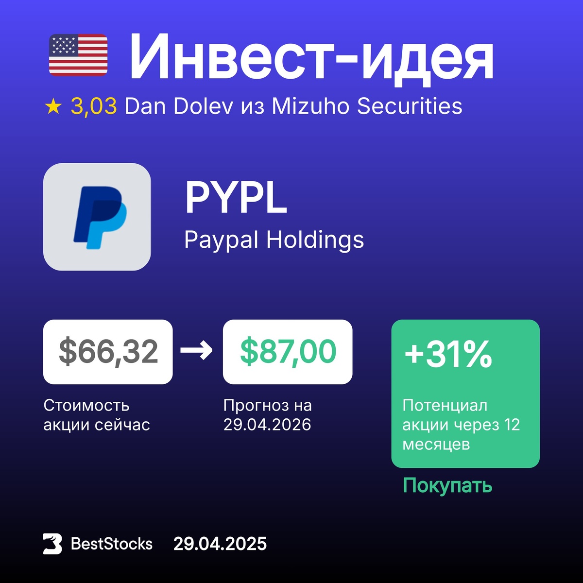 🇺🇸 Инвест-идея по акции Paypal Holdings Тикер: PYPL Прогнозная цена: $87 (+31%) Рекомендация: Покупать InvestRank акции: 5 из 10 Прогноз сделан: 29.04.2025 Прогноз до: 29.04.2026 Инвест-компания: Mizuho Securities Аналитик: Dan Dolev Ещё рекомендации на сегодня → ••••• 🏆 Сделали для вас список топ-25 лучших аналитиков в России и во всём мире. По каждому подробная информация: показатели доходности, успешность прогнозов и история рекомендаций по каждой акции. Уникальный инструмент, доступный на русском языке.
