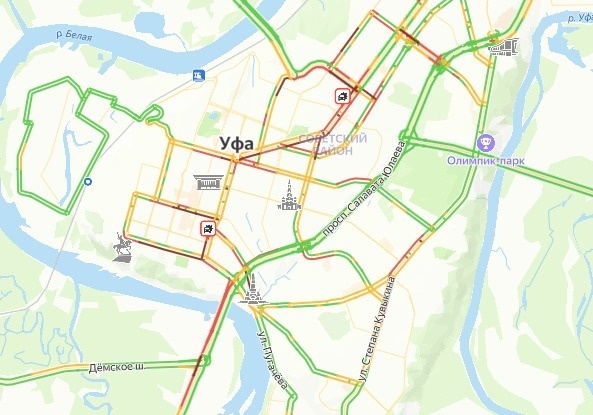 Уфу сковали девятибалльные пробки. По данным сервиса «Яндекс. Пробки», заторы наблюдаются на многих участках города. Так, движение парализовано на улицах Заки Валиди, Ленина, Пушкина, Революционной, 50-летия Октября, Зорге, Города Галле, Менделеева, 50 лет СССР, Жукова, Уфимское шоссе, Трамвайной, Седова, Сельской Богородской, Ульяновых и других. Затруднено движение по Бельскому мосту,