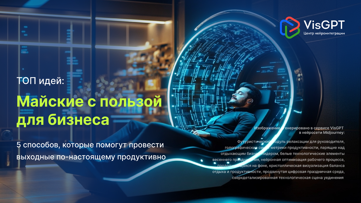Майские праздники — это не просто время для шашлыков и дачных посиделок, это стратегическая возможность для каждого руководителя и предпринимателя. В то время как большинство конкурентов расслабляются, дальновидные бизнесмены используют эти драгоценные дни для переосмысления стратегии, поиска новых идей и зарядки "творческих батарей". Правильно организованный отдых не только восстанавливает умственные ресурсы, но и открывает новые перспективы для развития бизнеса. Мы подготовили 5 проверенных способов, которые помогут вам сделать эти праздничные дни по-настоящему продуктивными, сочетая полезное с приятным. Готовы превратить отдых в инвестицию в будущее вашего бизнеса? Уделите время знакомству с возможностями искусственного интеллекта в сервисе VisGPT. Протестируйте создание концепций продуктов, визуализацию бизнес-процессов или генерацию маркетинговых материалов. Станьте тайным покупателем у конкурентов. Пройдите весь клиентский путь от первого контакта до послепродажного обслуживания
