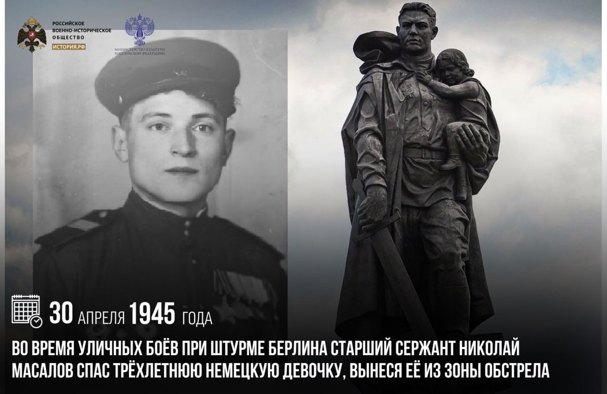 30 апреля 1945 года во время уличных боев при штурме Берлина старший сержант Николай Масалов спас трехлетнюю немецкую девочку, вынеся ее из зоны обстрела