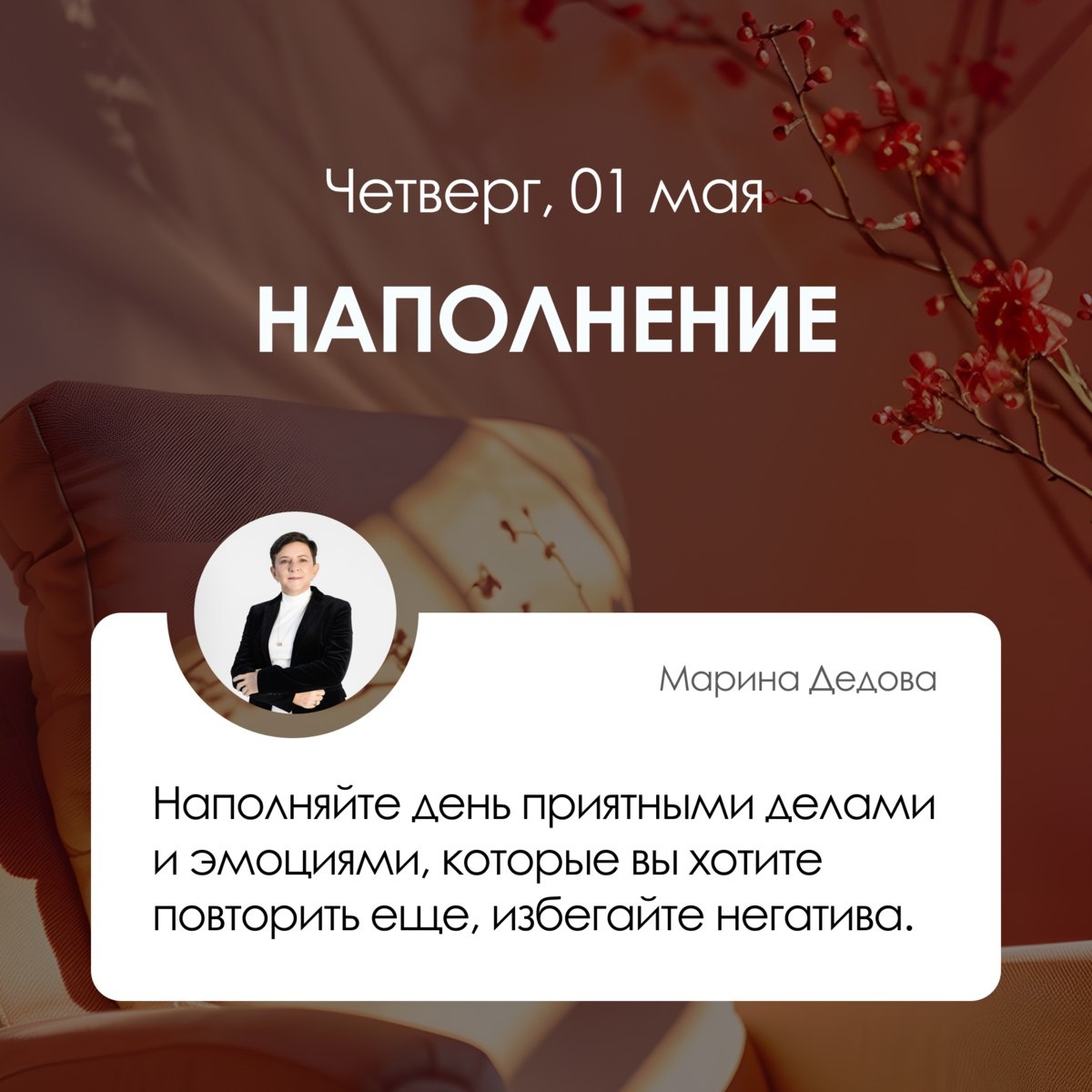 ✅ Прогноз на 1 мая, четверг Наполнение Наполняйте день приятными делами и эмоциями, которые вы хотите повторить еще, избегайте негатива. Постарайтесь провести его в приятной компании, сделайте что-то приятное близким людям. Не стоит выяснять отношения с противоположным полом, начинать лечение, кроме экстренных случаев. Аккуратность при работе с острыми предметами. Для Лошадей – следите за своими словами и поступками. Более внимательными и осторожными стоит быть людям, рожденным в год Крысы. Лучшие часы: Бык (01-03), Кролик (05-07), Коза (13-15) Худшие часы: Крыса (00-01, 23-00), Лошадь (11-13), Собака (19-21) Пустые часы: Собака (19-21), Свинья (21-23) *Прогноз дня указывает общие тенденции. Для важных событий даты лучше выбирать индивидуально. Лучшие часы – хорошее время для многих дел. Худшие часы – не подходят для большинства начинаний. Пустые часы – достаточно бесполезное время для важных дел.