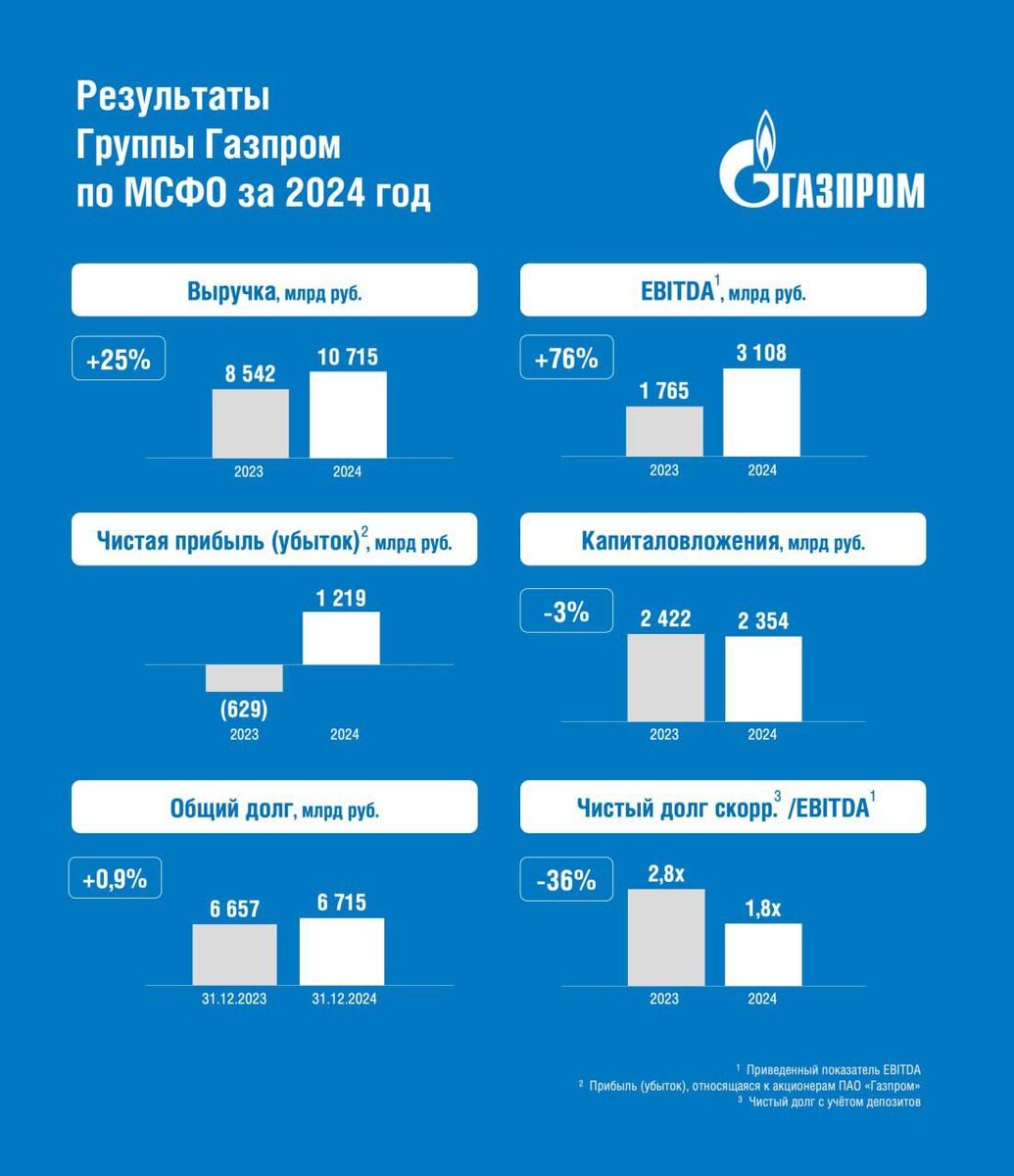 В ответ на пост Газпром ожил: прибыль снова триллионная «Газпром» опубликовал отчёт по МСФО за 2024 — и цифры бодрые: — Выручка: ₽10,7 трлн (+25%) — EBITDA: ₽3,1 трлн (+76%) — 3-й результат в истории — Чистая прибыль: ₽1,2 трлн (годом ранее был убыток) — Скорректированная прибыль: ₽1,43 трлн — Долг стабильный (₽6,7 трлн), а соотношение Чистый долг / EBITDA упало до 1,8x — Ликвидность: ₽1 трлн+ Капвложения сократились до ₽2,4 трлн, а курс и процентные доходы помогли вытянуть финрез. Главная интрига: будут ли дивиденды. Совет директоров решит в мае, собрание акционеров — в июне. Аналитики гадают, рынок ждёт. Пока акции чуть припали после отчёта — но всё равно в плюсе за день.