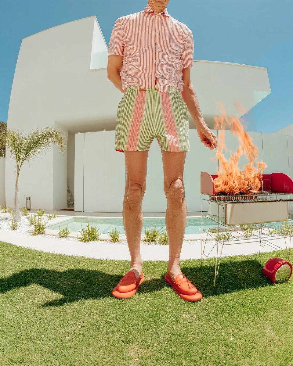 Создано на основе запроса: Convex distorted view of a man in colourful striped shorts and orange shoes standing on his lawn, next to a barbecue with flames coming out from it. The background features a blue sky, white walls, green grass, small trees, a fashionable photography style, high saturation, and a sense of humour captured with a fisheye lens. --- Автоперевод: Выпуклый искаженный вид на человека в красочных полосатых шортах и апельсиновых туфлях, стоящих на его лужайке, рядом с барбекю с пламенем, выходящим из него. Хорошо вышло? 🤔 https://dzen.ru/id/65c0c65c86e4f837c27b24d7 #ИИ #AI #нейросеть #midjourney #art