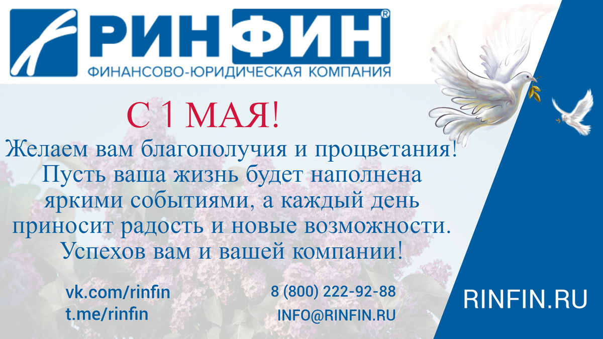 Компания РИНФИН от всей души поздравляет вас с праздником Весны и Труда! Этот замечательный день – символ созидания, вдохновения и новых начинаний. Он напоминает нам о важности труда, который является основой благополучия и процветания. В этот светлый праздник мы хотим пожелать вам крепкого здоровья, неиссякаемой энергии, весеннего настроения и успехов во всех ваших начинаниях! Пусть каждый ваш день будет наполнен радостью, вдохновением и уверенностью в завтрашнем дне! Мы, в РИНФИН, убеждены, что труд – это не только работа, но и возможность развиваться, достигать поставленных целей и строить прочный фундамент для будущего. Мы гордимся тем, что помогаем нашим клиентам реализовывать свои амбиции, предоставляя качественные и надежные юридические услуги. РИНФИН – Ваш надежный партнер в бизнесе! В мире, где регулирование постоянно меняется, а требования к бизнесу становятся все более строгими, очень важно иметь надежного партнера, который поможет вам ориентироваться в сложных юридических в