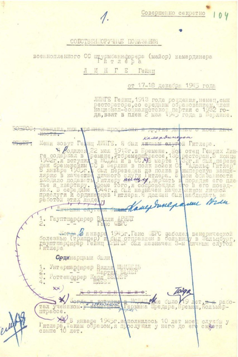 К 80-летию Победы в Великой Отечественной войне Федеральная служба безопасности обнародовала ранее засекреченные подробности о самоубийстве немецкого диктатора Адольфа Гитлера. В числе материалов есть и показания камердинера фюрера Хайнца (Гейнца) Линге. По словам арестованных из ближайшего окружения Гитлера, именно Линге первым зашел в кабинет фюрера после его самоубийства. Так, 30 апреля 1945 года штурмбаннфюрер Линге сообщил группенфюреру СС, генерал-лейтенанту полиции Гансу Раттенхуберу, что Гитлера больше нет и что Линге «выполнил самый тяжелый приказ в своей жизни…». Ева Браун вошла в комнату Гитлера. После короткого времени я услышал выстрел. Об этом я тотчас известил Бормана, который находился в прихожей. Вместе мы вошли в рабочий кабинет Гитлера… Гитлер сидел с простреленным правым виском на софе. На ковре лежали его два пистолета. Рядом с ним сидела его жена, у которой огнестрельной раны не было… Хайнц Линге