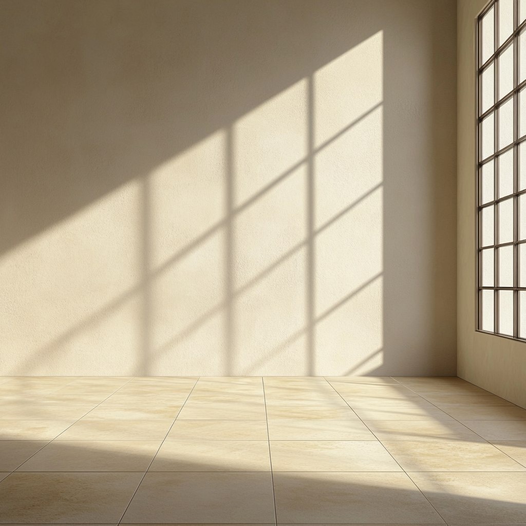 Создано на основе запроса: empty room, wall is off white beige, the flooring is beige matte tiles, sunshine shadows