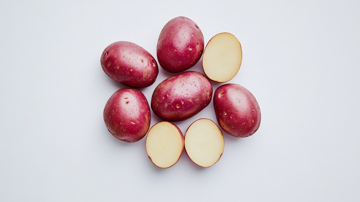 Создано на основе запроса: A group of 7 Unica potatoes placed closely together on a plain white background. The potatoes are medium-sized and oval, with smooth red skin. Five whole potatoes are included, and two are cut in half to show the light yellow interior. The arrangement is compact and orderly. The lighting is neutral and even, clearly displaying the natural color, surface texture, and quality of the potatoes for agricultural or commercial presentation.