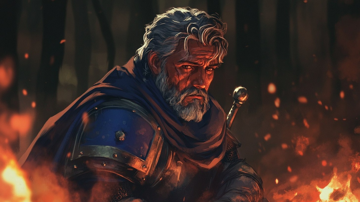 Создано на основе запроса: an dark fantasy emotionnal scene of an 50 years male human character with black and grey hair, he has grey beard and wearing an blue paladin armor and cloth looking at us with an pure emotionnal look. He is sitting in front of an bonfire campment at night. We can see the embers reflection on hi eyes. He seems to be tired but ready for the next adventure. Red and shadows atmosphere, night dark forest in the background, embers effects, bonfire reflection. Dnd style, dark fantasy style, ink style, pay attention to the details. --- Автоперевод: Темная фэнтезийная эмоциональная сцена 50 -летнего мужского человеческого персонажа с черными и седыми волосами, у него серая борода и голубая паладинская броня и ткань, смотрящая на нас с чистым эмоциональным взглядом. Круто выглядит? 🤔 https://dzen.ru/id/65c0c65c86e4f837c27b24d7 #ИИ #AI #нейросеть #midjourney #art