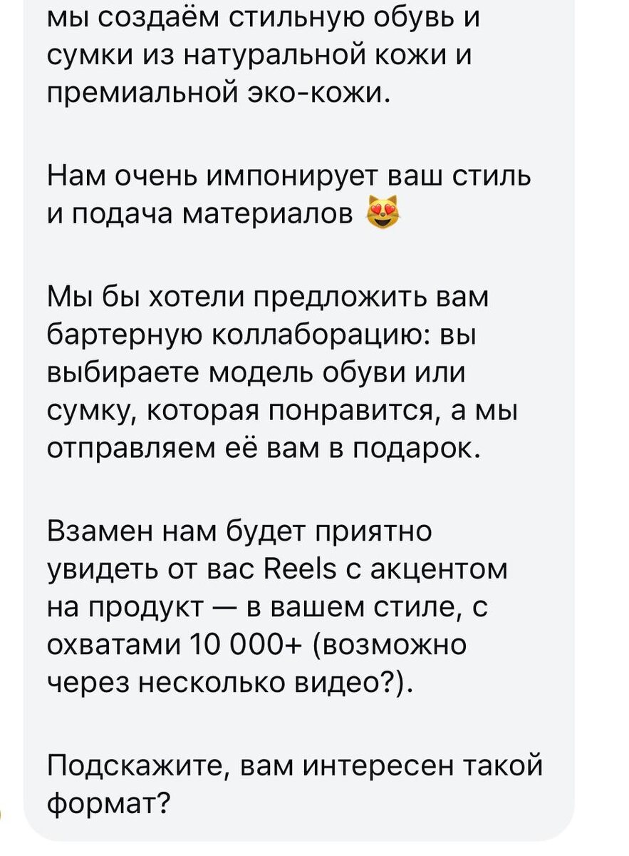 Ожидание: блог растет, будут классные бренды писать Реальность: 😆 Кстати парадокс в том, что небольшие бренды спокойно платят за рекламу, а крупные бренды вот так пишут, потому что могут себе позволить, все равно куча девчонок согласится еще как, лишь бы засветиться. Я же человек простой, детей кормить туфлями не могу (ладно бы еще натуральная кожа, ее можно есть 🤣) - отказываюсь