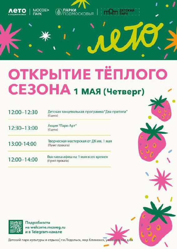 ✨ Приглашаем гостей и жителей нашего города на мероприятие «Открытие теплого сезона»🌱 Вас ждет: 🌿 Детская танцевальная программа «Два притопа» 🌿 Акция «Парк-Арт» 🌿 Творческая мастерская от ДК им. 1 мая 🌿 Выставка афиш на 1 мая всех времен 🚫 Возраст: 0+ 📆 01.05.2025 🕒 12:00 🏢 Детский парк культуры и отдыха 📍 г. Подольск, мкр. Климовск, ул. Заводская, 6а 💰 Вход свободный❗️ #webПодольск ✅ Мероприятия Подольск https://dzen.ru/id/66ed500f7b5671493eca3fd6 http://vk.com/podolsk_events http://dzen.ru/podolsk_events