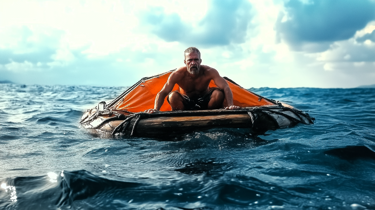 Когда он снова забирается в плот, его трясёт. Он мокрый, босой, с рассечёнными руками, но жив. Аварийный комплект рядом. Его единственный багаж в этом новом мире — шестиместный плот и ящик. Вокруг простиралась только чёрная вода и бескрайнее небо, не дающие ответов.