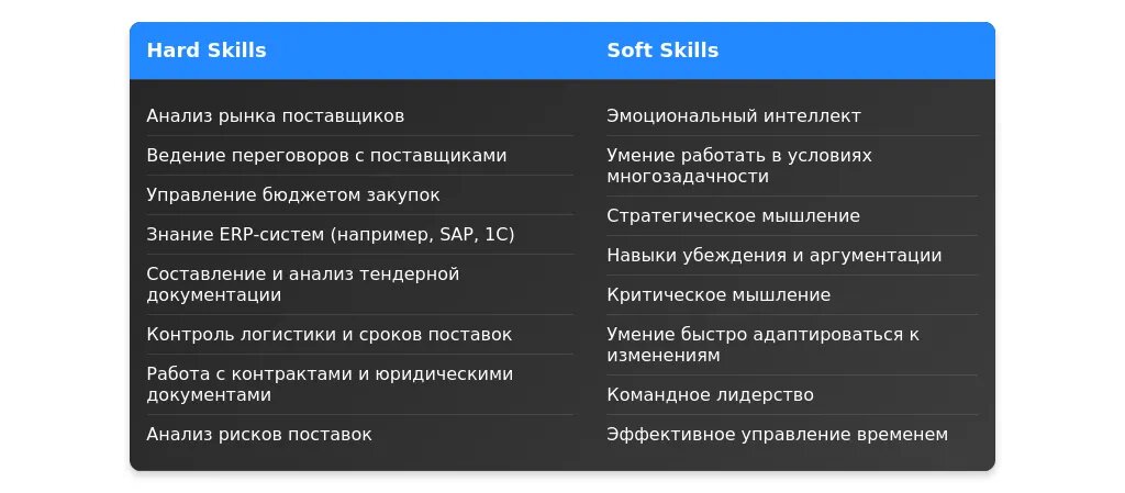 Ключевые навыки (анализ рынка, переговоры, управление поставщиками).
