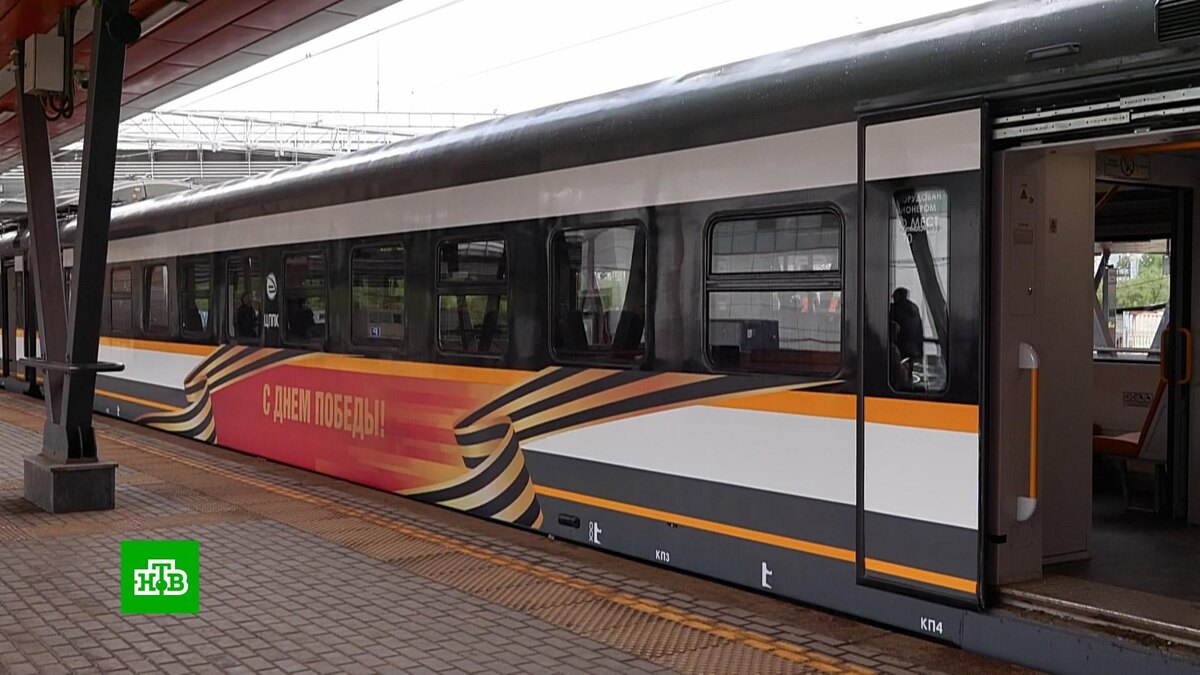 [ Смотреть видео на сайте НТВ ] На D4 запустят поезд повышенной комфортности, украшенный символикой Великой Победы. На четвертый Московский центральный диаметр выйдет тематический поезд к 80-летию Великой Победы. Новейший состав российского производства украшен Георгиевской лентой, поздравительными лозунгами и плакатами, посвященными подвигам советских солдат и работников транспортной отрасли в годы войны. Олег Ульянов, заместитель генерального директора, директор по обеспечению перевозочной деятельности ЦППК: «На что направлен этот поезд? На то, чтобы о Великой Отечественной войне помнили не только 9 Мая, а чтобы это было ежедневно». Тематический состав отличается повышенным комфортом. Вагоны оснащены удобными сиденьями с USB-зарядками, креплениями для велосипедов и выдвижными подножками, чтобы пассажирам было удобно заходить в поезд с низких платформ. [ Смотреть видео на сайте НТВ ]