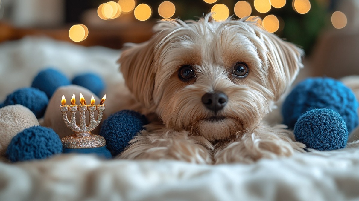 Создано на основе запроса: Hanukkah pet setup Blue and white chew toys, menorah plush, and festive dog collar