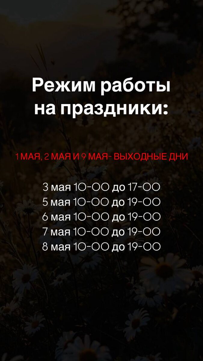 πΠ Π΅ΠΆΠΈΠΌ ΡΠ°Π±ΠΎΡΡ Π½Π° ΠΏΡΠ°Π·Π΄Π½ΠΈΠΊΠΈ: 1 ΠΌΠ°Ρ , 2 ΠΌΠ°Ρ ΠΈ 9 ΠΌΠ°Ρ β ΠΠ«Π₯ΠΠΠΠ«Π ΠΠΠ 3 ΠΌΠ°Ρ 10-00 Π΄ΠΎ 17-00 5 ΠΌΠ°Ρ 10-00 Π΄ΠΎ 19-00 6 ΠΌΠ°Ρ 10-00 Π΄ΠΎ 19-00 7 ΠΌΠ°Ρ 10-00 Π΄ΠΎ 19-00 8 ΠΌΠ°Ρ 10-00 Π΄ΠΎ 19-00