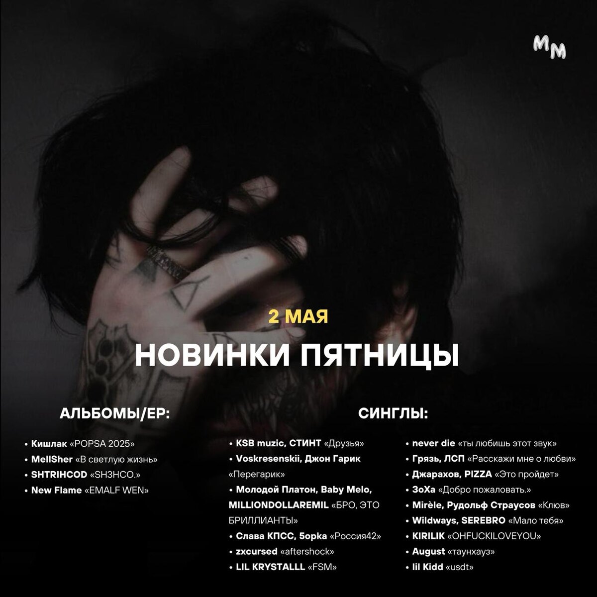 🗓 НОВИНКИ ПЯТНИЦЫ — 2 МАЯ Альбомы/EP: • Кишлак «POPSA 2025» • MellSher «В светлую жизнь» • SHTRIHCOD «SH3HCO.» • New Flame «EMALF WEN» Синглы: • KSB muzic, СТИНТ «Друзья» • Voskresenskii, Джон Гарик «Перегарик» • Молодой Платон, Baby Melo, MILLIONDOLLAREMIL «БРО, ЭТО БРИЛЛИАНТЫ» • Слава КПСС, 5opka «Россия42» • zxcursed «aftershock» • LIL KRYSTALLL «17» • never die «ты любишь этот звук» • Грязь, ЛСП «Расскажи мне о любви» • Kunteynir «Помним» • Джарахов, PIZZA «Это пройдет» • ЗоХа «Добро пожаловать.» • Mirèle, Рудольф Страусов «Клюв» • Wildways, SEREBRO «Мало тебя» • KIRILIK «OHFUCKILOVEYOU» • paper illustrator «шашлычки» • August «таунхауз» • zarya «Стены» • BORIS REDWALL «FIRE MONSTER» • lil Kidd «usdt» • Милана Хаметова «Бабочки» • АДЛИН «Неправильно» • ХЛЕБ «Untitled» • СЕКОНД ХЕНД «TAXI» • lucia love «palexia flow» • JackLooney, mafanya «Просто ходим» • ghasaii, elox1m «I KNOW» • Артем Кей, ТОМА «Кискисмяумяу 2.0» • SABU «NNN» • maiiki «crushroom» • Anonymous Ember «TRAP A HO