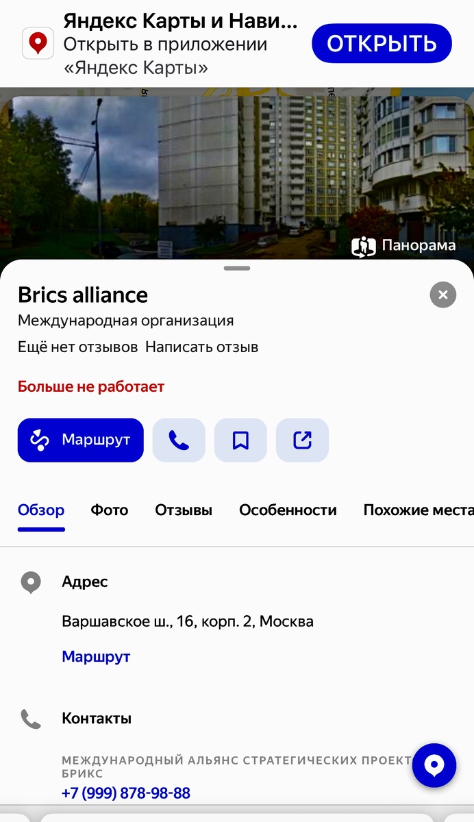 Зарегистрирована Автономная некоммерческая организация содействия развитию международных связей в рамках группы БРИКС «Международный Альянс стратегических проектов БРИКС» (это полное название) 29 февраля 2016 г. по адресу (ЭТО ВАЖНО!!!) город Москва, ул ХХХХХХХ, д. ХХ стр. Х, кв. ХХХ. Фактически, по месту жительства учредителя – Зеленцовой Ларисы Николаевны. Ну бывает так, нет офиса, не нужен он, денег нет на аренду на первых порах, также, как и на сотрудников – ничего страшного.