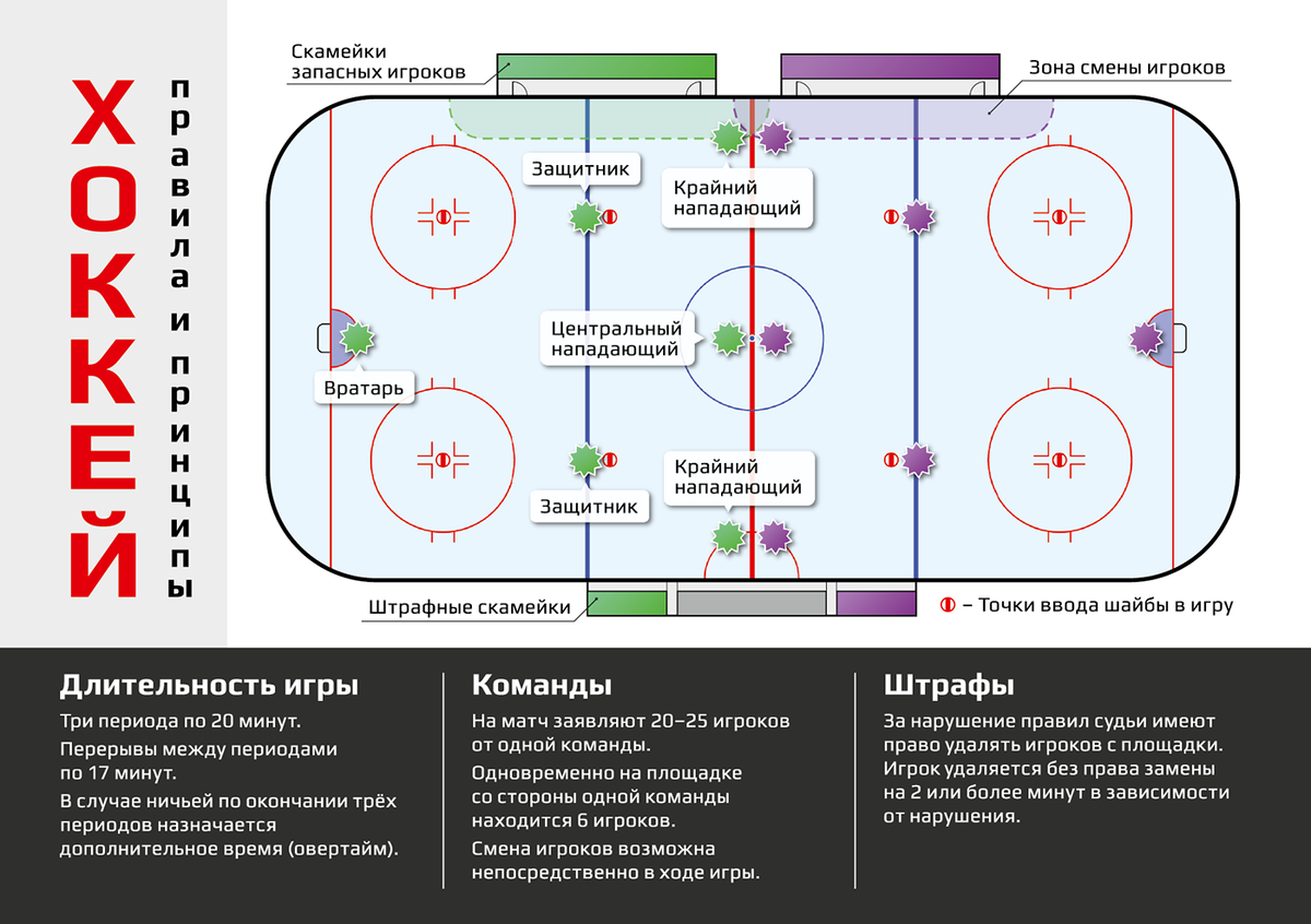 • Зона обороны (своя зона): Здесь основная задача – предотвратить проникновение соперника к своим воротам, отбирать шайбу и начинать атаку.