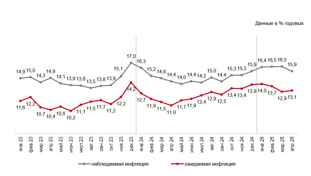 В апреле 2025 года, по данным опроса ООО «инФОМ», оценка инфляции, которую граждане ожидают через год, составила 13,1% по сравнению с 12,9% месяцем ранее. Ожидания увеличились у опрошенных, которые имеют сбережения, а у тех, кто не располагает сбережениями, оценки будущей инфляции снизились.