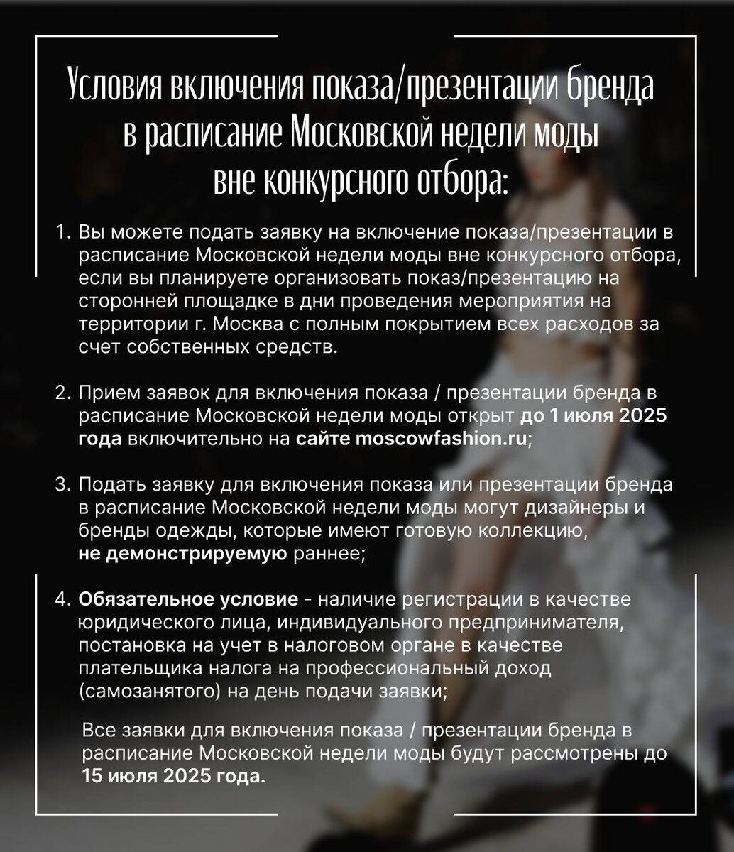 Теперь у дизайнеров есть возможность стать участником Московской недели моды и попасть в расписание вне конкурсного отбора⚡️ Условия простые — вы можете подать заявку на включение показа или презентации в расписание Московской недели моды вне конкурсного отбора, если планируете организовать показ или презентацию в столице в дни проведения мероприятия на сторонней площадке. И вот небольшой туториал о том, как подать заявку для участия по этому формату, и чек-лист с подробными условиями. Подать заявку для включения показа / презентации бренда в расписание Московской недели моды вне конкурсного отбора можно до 1 июля на сайте события.