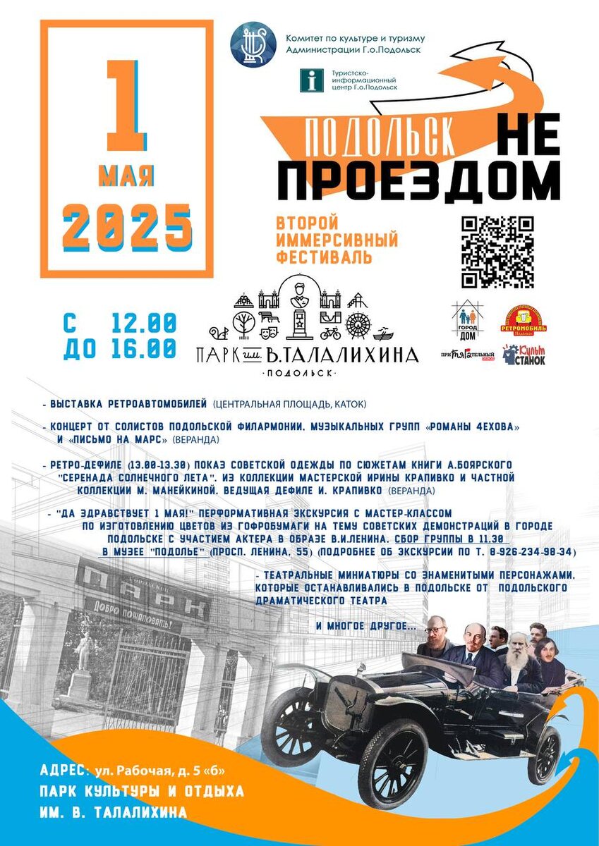 ✨ Фестиваль «Подольск не проездом» в Парке 🎉 1 мая с 12:00 до 16:00 В программе: 🔻Выставка ретроавтомобилей 🔻Концерт солистов Подольской филармонии и музыкальных групп "Романы Чехова" и "Письмо на Марс" 🔻Ретро-дефиле советской одежды по мотивам книги А. Боярского "Серенада солнечного лета" (13:00–13:30) 🔻Перформативная экскурсия с мастер-классом по изготовлению цветов из гофробумаги на тему советских демонстраций (с участием актёра в образе В. И. Ленина, сбор группы в 11:30, музей "Подолье", просп. Ленина, 55) 🔻Театральные миниатюры с участием исторических персонажей 📆 01.05.2025 🕒 12:00 🏢 Парк культуры и отдыха им. В. Талалихина 📍 г. Подольск, ул. Рабочая, 5Б 💰 Вход свободный❗️ #webПодольск ✅ Мероприятия Подольск https://dzen.ru/id/66ed500f7b5671493eca3fd6 http://vk.com/podolsk_events http://dzen.ru/podolsk_events