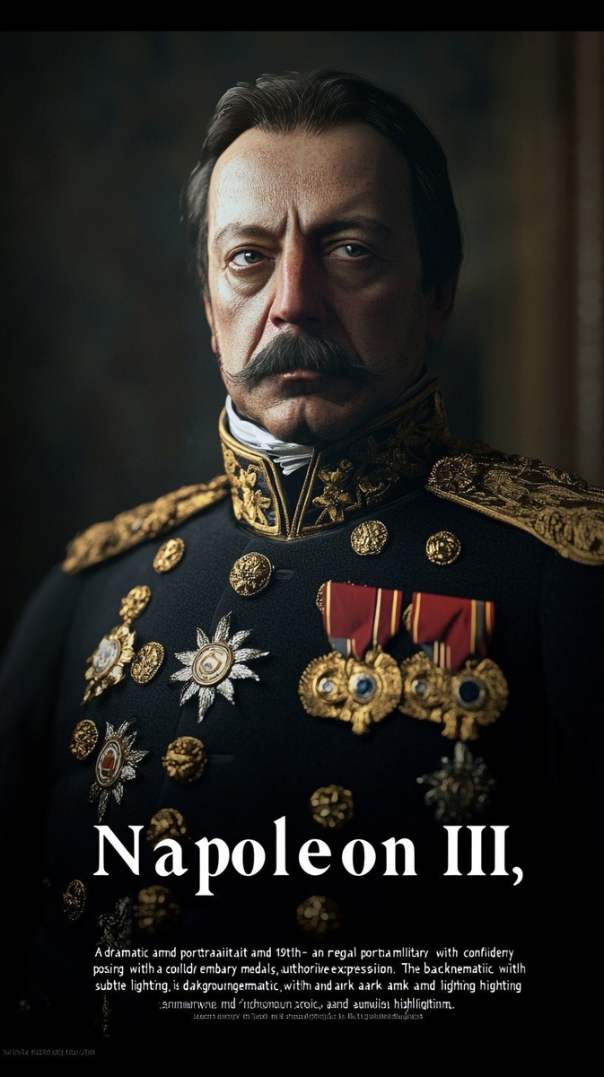 Создано на основе запроса: "A dramatic and regal portrait of Napoleon III, wearing an ornate 19th-century military uniform with gold