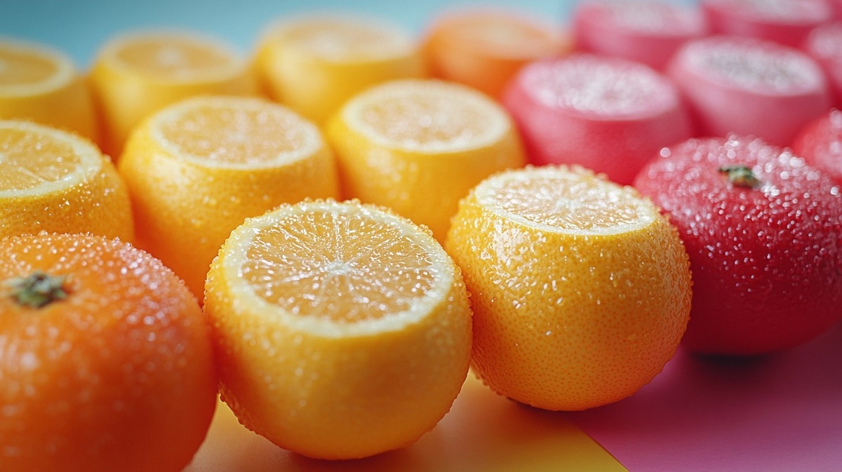 Создано на основе запроса: Tropical fruits arranged neatly on colored paper background, summer exotic food, 4k, dramatic lighting, unique