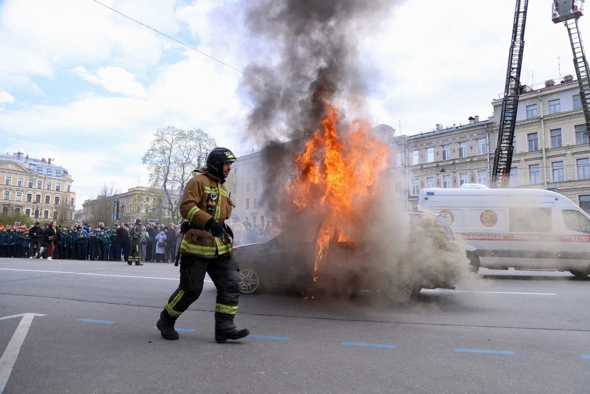 На Манежной площади сегодня днем тушили условный пожар. Также спасатели показывали алгоритм действий при ликвидации последствий ДТП. Также состоялось награждение наиболее отличившихся сотрудников. Событие приурочили к грядущему празднованию 376-летия пожарной охраны России. Фото: Павел Гофман/Город+ Подпишись на Город+