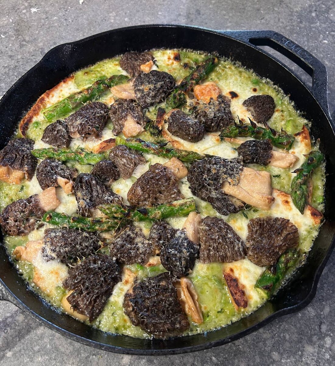 #соль_блюдодня Ризотто со сморчками, зеленью и копченым сыром Наш безусловный уже хит на Meet Me at the Market, из почти всех весенних продуктов разом. Вкусно невероятно. Делюсь рецептом (тут хватит порции на три): Для ризотто 150 г риса 1 луковица шалота 300 мл куриного бульона 60 мл вина 2 ст.л. оливкового масла 3 ст.л. сливочного масла Соль-перец Пармезан Для подачи 1 ст.л. сливочного масла 6-7 веточек спаржи Граммов по сто (пара горстей) зеленого горошка и сморчков Веточек 6 спаржи 80 г копченого адыгейского сыра Для начала делаем классическое ризотто: разогрейте оливковое масло и обжарьте мелко нарезанный шалот, добавьте рис. Перемешайте, плесните вина, дайте выпарится. Теперь готовьте, помешивая, все время подливая горячий бульон. Когда будет почти готово (но именно почти, не аль денте, а меньше), снимите с огня и вмешайте теплое сливочное масло и пармезан. Параллельно обжарьте на сливочном масле горошек, сморчки (их лучше предварительно отварить) и нарезанную спаржу, в конц