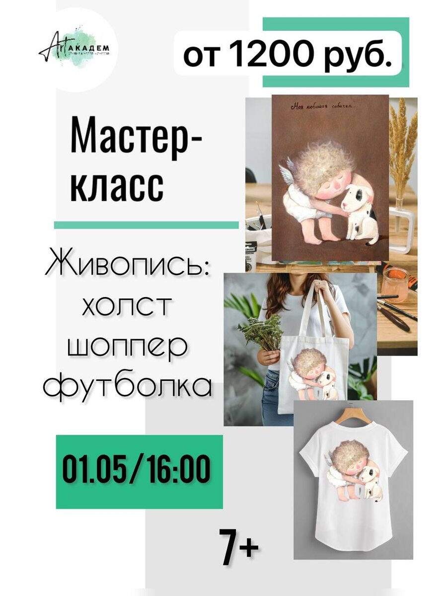1 мая (четверг) 16:00 - свободных мест 4! Приглашаем Вас на Мастер-класс по живописи на холстах, футболках, шопперах. 👩🎨«Свободный сюжет» ( можно выбрать любой из 1000 представленных) . Неважно, являетесь ли Вы новичком или уже имеете опыт — наш мастер покажет Вам все секреты создания картин. Вы просто привезите с собой хорошее настроение, а мы предоставим все необходимые материалы. 🔍 Записывайтесь прямо сейчас — количество мест ограничено! 📞 +7 (992) 331-83-51 ЛС @ArtAkadem66 📍 АртАкадем, Академика Ландау 45. 🪙 холст на подрамнике 30*40 -1500 руб. 40*50 -1900руб. , 🪙холст на картоне 30*40 или 30*30 см -1200 руб., 20*30см-850 руб, 🪙футболка -1300 руб. 🪙сумка/шоппер/рюкзак-1200 руб. Не упустите шанс погрузиться в мир искусства!