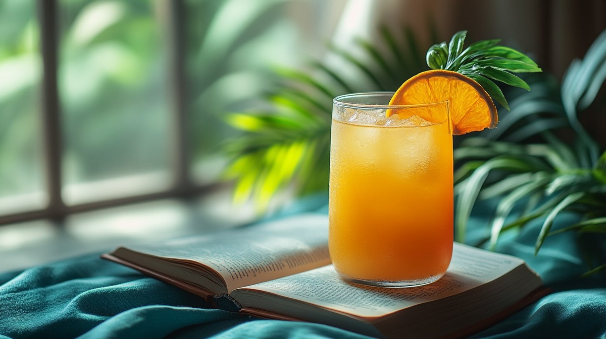 Создано на основе запроса: Beach towel with tropical drink and book, palm shadow overlay, summer rest vibe, 4k, dramatic lighting, unique