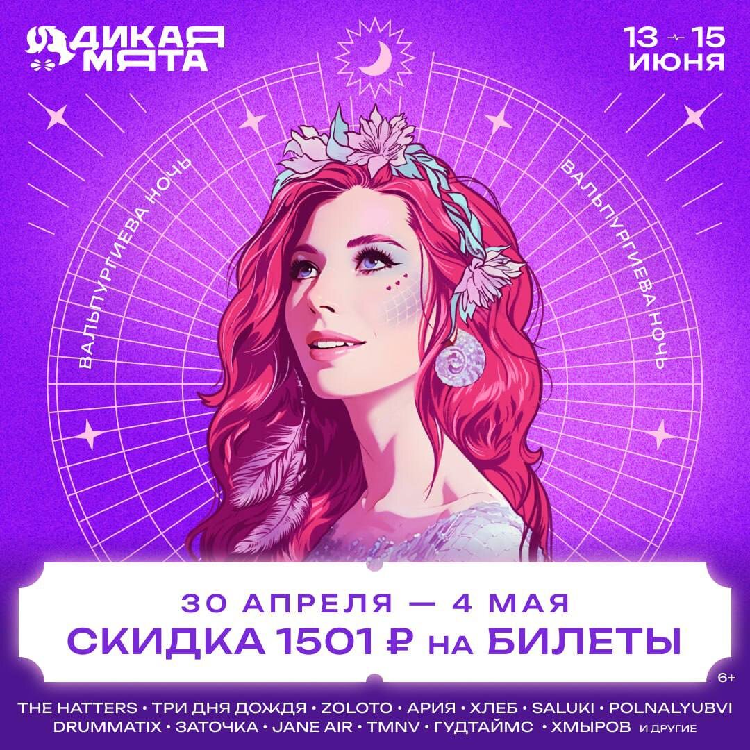 С этого часа и до полуночи 4 мая на «Дикой Мяте» проходит акция «Вальпургиева ночь» — билеты на фестиваль доступны со скидкой 1501 рубль