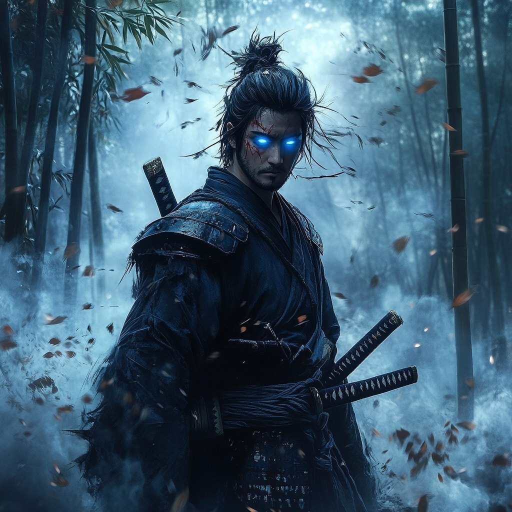 Создано на основе запроса: Anime-style samurai standing silently in a misty bamboo forest, wearing traditional dark kimono with torn edges, katana resting on shoulder, glowing blue eyes, scar across face, calm but deadly expression, wind blowing leaves around, cinematic atmosphere, soft ambient lighting, painterly style, ultra detailed --- Автоперевод: Самураи в аниме, стоящем молча в туманном бамбуковом лесу, одетый в традиционный темный кимоно с разорванными краями, катана, отдыхая на плече, светящиеся голубые глаза, шрам на лице, спокойное, но смертельное выражение, дует ветром листья, кинематографическая атмосфера, мягкое окружающее освещение, стиль художественного стиля, ультра детализация Неплохо вышло? 🤔 https://dzen.ru/id/65c0c65c86e4f837c27b24d7 #ИИ #AI #нейросеть #midjourney #art